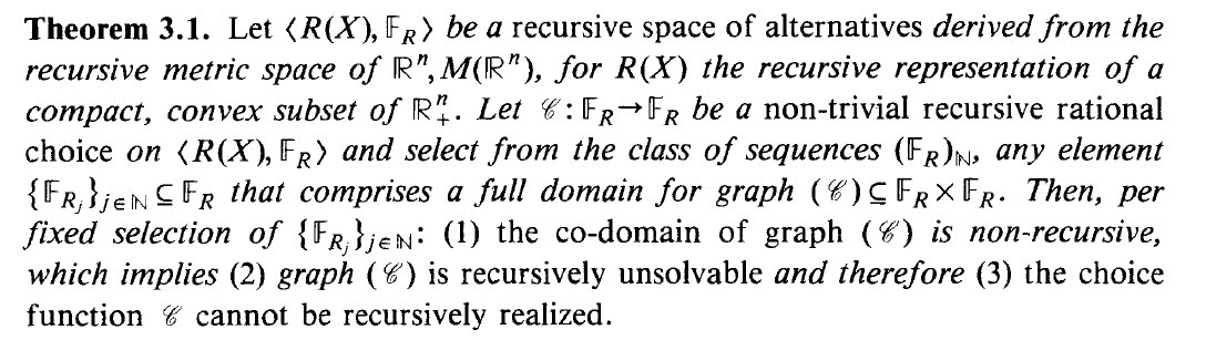 The point we are trying to make with Theorem 3.1 is simply this. The theorem of representable choice functions in the neoclassical setting, and thus consequently the theory of neoclassical demand correspondences and the theory of SDF-derived social welfare functions, when defined on families of compact subsets of Rn, presumes the possibility of a mathematical correspondence that, even in principle, cannot be performed or realized in effectively computable terms under the weakest, and therefore best, possible circumstances of recursive approximation. As we have mentioned previously, but do not mind stating yet once more, this appears to have serious consequences for the foundations of neoclassical mathematical economics.